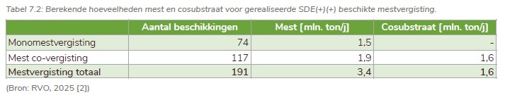 Er is jaarlijks 3,4 mln. ton mest en 1,6 mln. ton cosubstraat nodig om de SDE(+)(+)-beschikte hoeveelheid energie uit mestvergisting te produceren (zie tabel 7.2 uit het rapport). Deze hoeveelheden zijn vergelijkbaar met die van vorig jaar. In totaal werd er in Nederland in 2024 74,4 mln. ton mest geproduceerd (CBS, 2025), wat betekent dat 5% van het Nederlandse mestvolume wordt vergist.