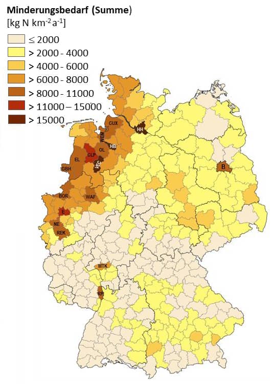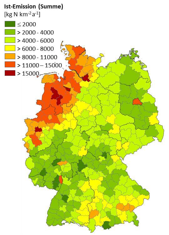 In totaal zijn de stikstofverliezen naar het milieu in heel Duitsland ongeveer twee miljoen ton N, wat neerkomt op ongeveer 55 kg stikstof per hectare. Om de doelen te halen zou dat verlies met 55% verminderd moeten worden. Aangezien de landbouw, verkeer en industrie samen meer dan 90% van de emissies veroorzaken zouden deze sectoren de grootste opgave hebben. Onderstaande figuur laat zien dat er met name voor ammoniak en nitraat, welke beide uit de landbouw komen, in absolute zin de grootste opgave ligt.