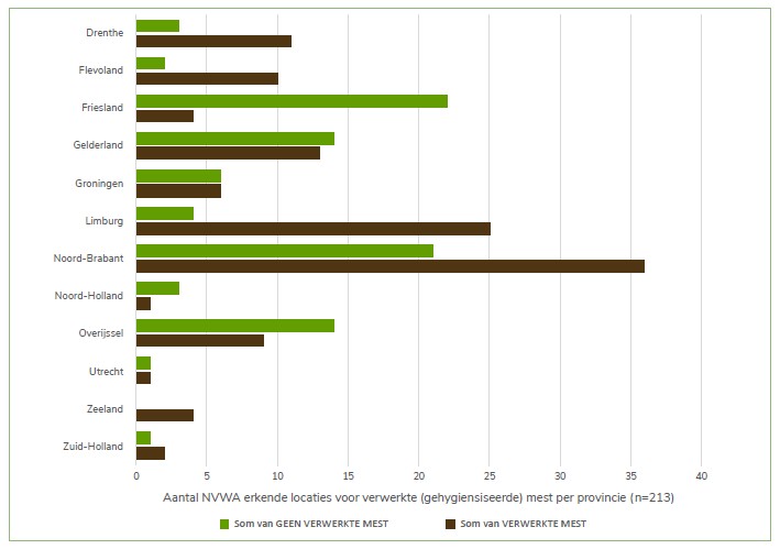 De NVWA maakt onderscheid tussen installaties die gehygiëniseerde/verwerkte mest produceren en installaties die geen gehygiëniseerde/geen verwerkte mest produceren. Met name Noord-Brabant (36), Limburg (25) en Gelderland (13) kennen een hoog aantal bedrijven die mest hygiëniseren (voor export). Friesland (22) en Noord-Brabant (21) hebben een groot aantal bedrijven dat niet hygiëniseert, waarschijnlijk voor toepassing van de mestproducten in de regio of op het eigen landbouwbedrijf. Het is mogelijk dat deze mestproducten door andere schakels verderop in de mestketen alsnog gehygiëniseerd worden.
