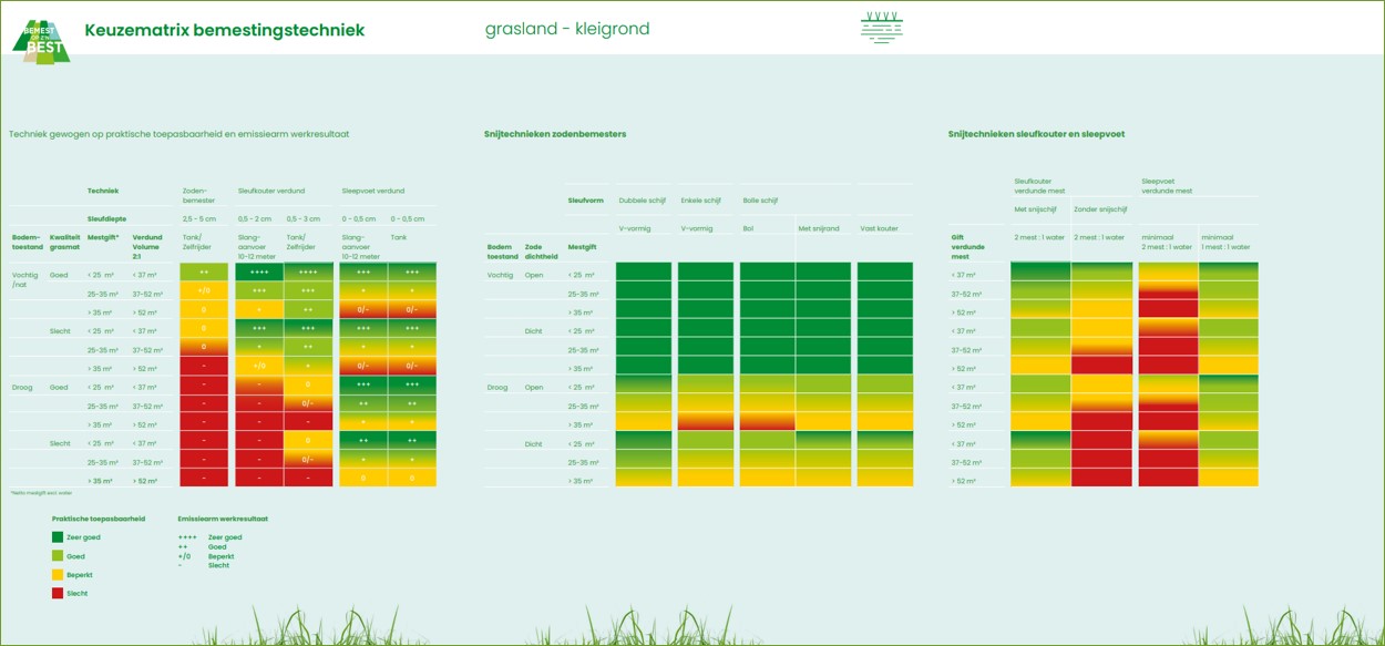 Voor de bemesting van grasland of bouwland zijn verschillende types bemesters beschikbaar. Maar welke gebruik je wanneer? Hiervoor zijn er keuzematrixen gemaakt, waarmee je heel praktisch de techniek kiezen die het beste werkresultaat geeft onder verschillende omstandigheden. Zo behoud je zo veel mogelijk stikstof voor het gewas en belast je het milieu zo min mogelijk.
