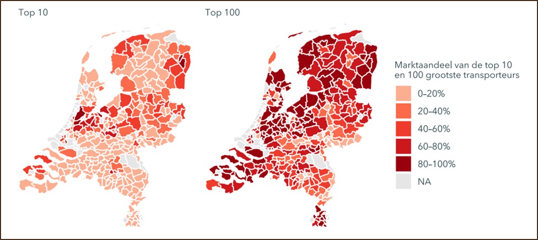 In vrijwel geen enkele gemeente heeft een enkel bedrijf een dominante marktpositie. In de meeste gemeenten heeft de top 10 van grootste mesttransporteurs een marktaandeel van 0 tot 20%. In aantal gemeenten is dat overigens wel meer dan 60%. In slechts één van de 342 gemeenten heeft een bedrijf een marktaandeel van meer dan 50% in de afzet van rundveedrijfmest en bij varkensmest is dat bij twee gemeenten het geval.