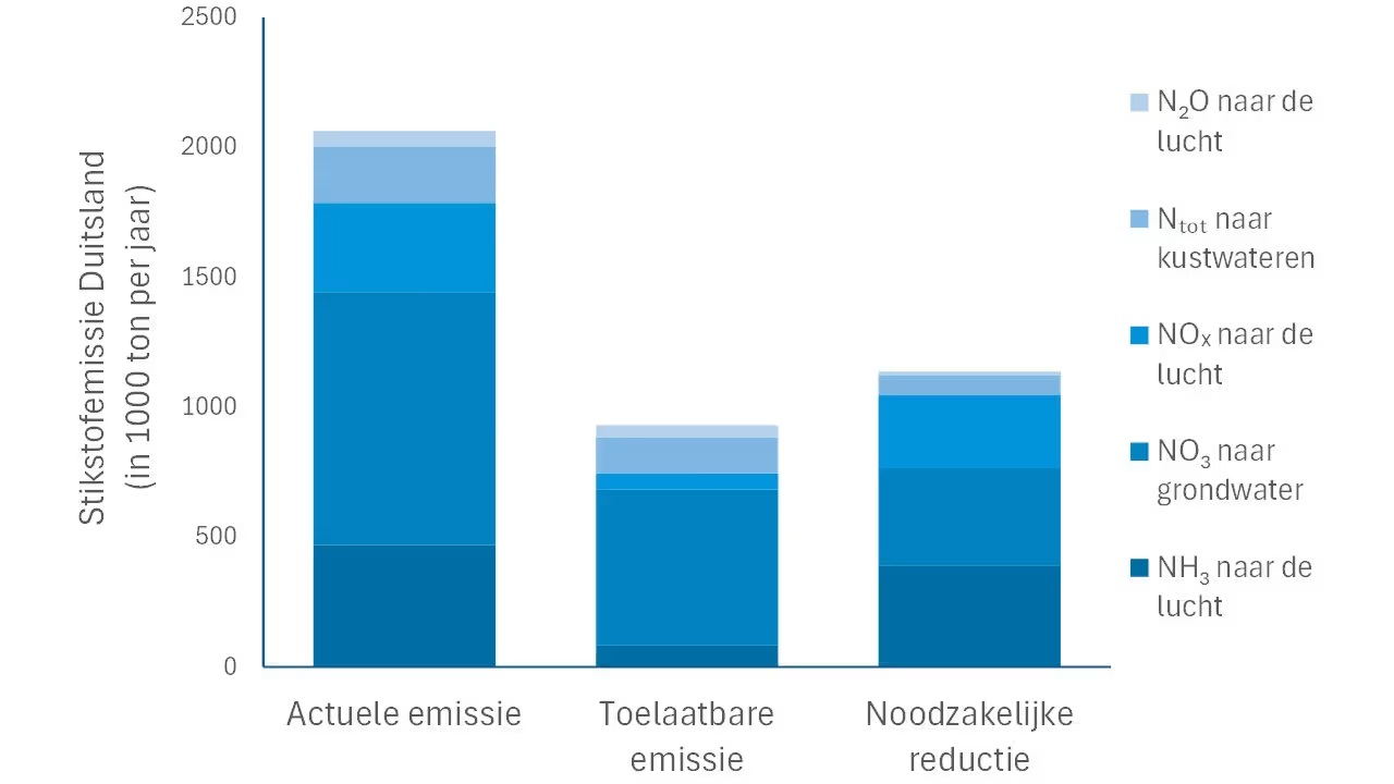 In totaal zijn de stikstofverliezen naar het milieu in heel Duitsland ongeveer twee miljoen ton N, wat neerkomt op ongeveer 55 kg stikstof per hectare. Om de doelen te halen zou dat verlies met 55% verminderd moeten worden. Aangezien de landbouw, verkeer en industrie samen meer dan 90% van de emissies veroorzaken zouden deze sectoren de grootste opgave hebben. Onderstaande figuur laat zien dat er met name voor ammoniak en nitraat, welke beide uit de landbouw komen, in absolute zin de grootste opgave ligt.