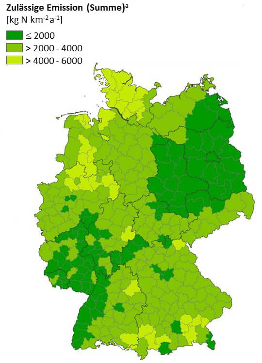 Per soort stikstof de huidige emissie, wat voor milieudoelen het maximum is en hieruit berekend de opgave, op landelijke schaal. Gemiddeld over Duitsland zou de emissie per hectare van 55 naar 25 kg N per hectare moeten dalen.